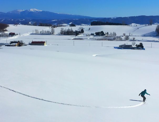 We only go to quiet PowSurf spots that have good powder snow. From there, you'll receive safe instructions on how to surf on powder snow and have fun. You'll hike for another 10-30min, then surf on powder! We usually use same hike up line and have few run in same spot.